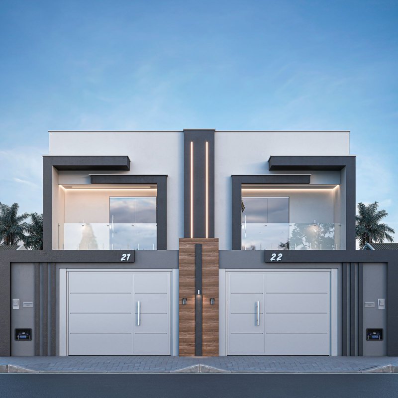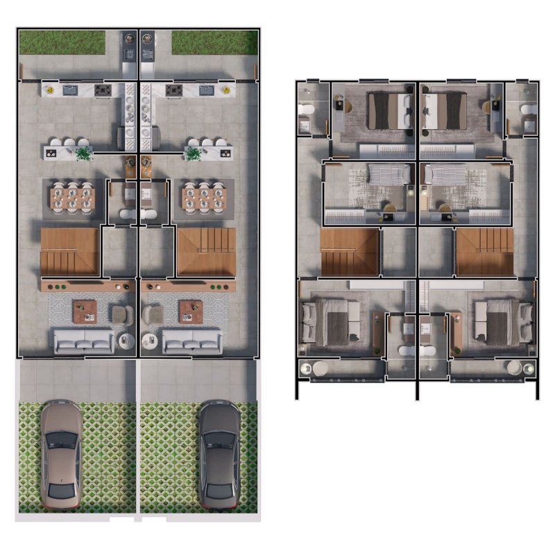 Pavimento inferior: Garagem com 2 vagas, sala de estar, sala de jantar, cozinha conceito aberto, banheiro social, garden com área social e espaço para área gourmet.