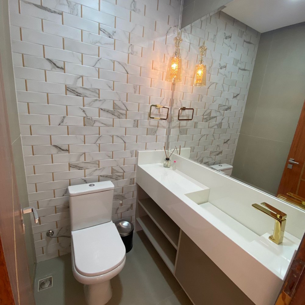 No pavimento térreo, você encontrará uma ampla sala de estar, lavabo, suíte, cozinha com bancada em granito, integrada a uma área gourmet espaçosa, com churrasqueira, área de serviço e uma convidativa piscina.